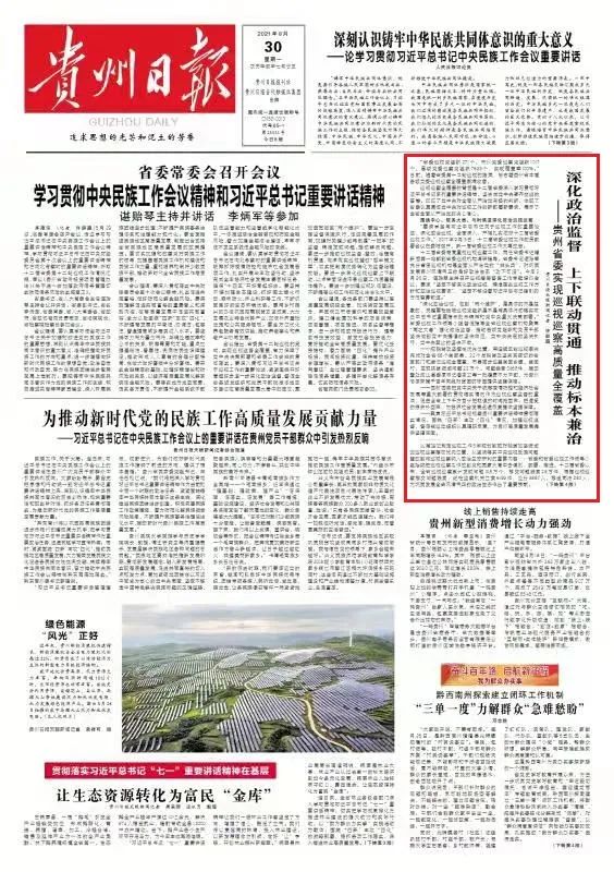 《贵州日报》头版:深化政治监督 上下联动贯通 推动标本兼治 ——贵州省委实现巡视巡察高质量全覆盖