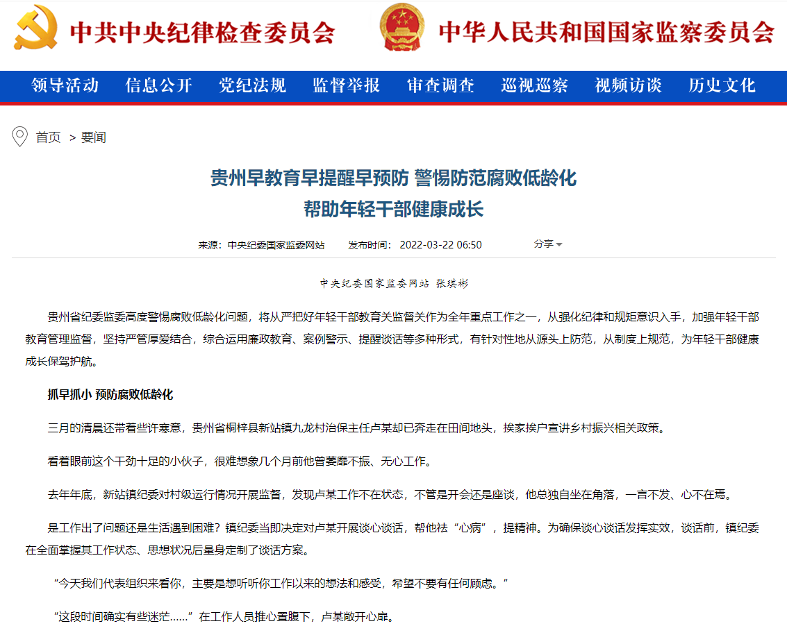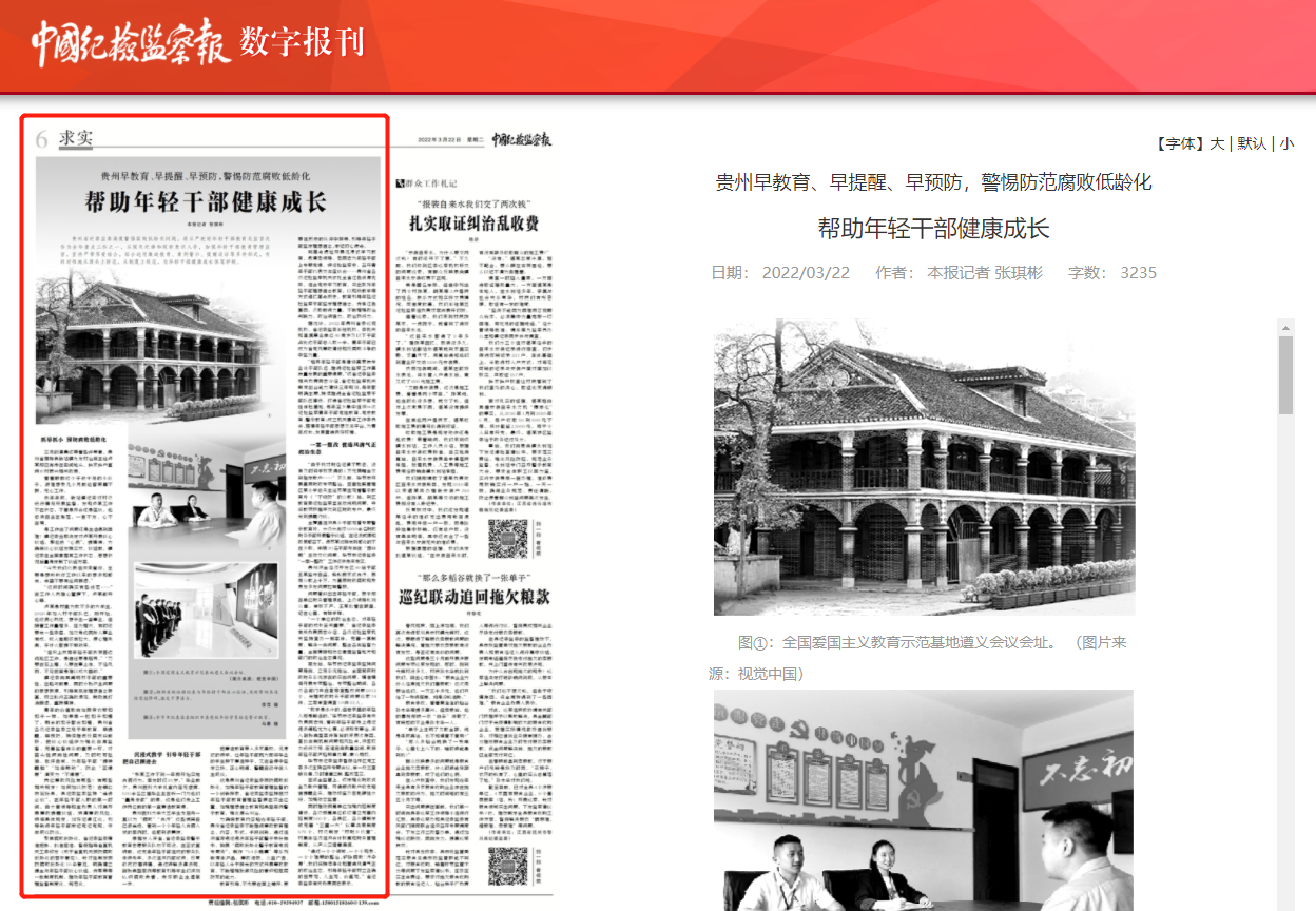中国纪检监察报》“求实”版头条、中央纪委国家监委网站:贵州早教育、早提醒、早预防,警惕防范腐败低龄化 帮助年轻干部健康成长