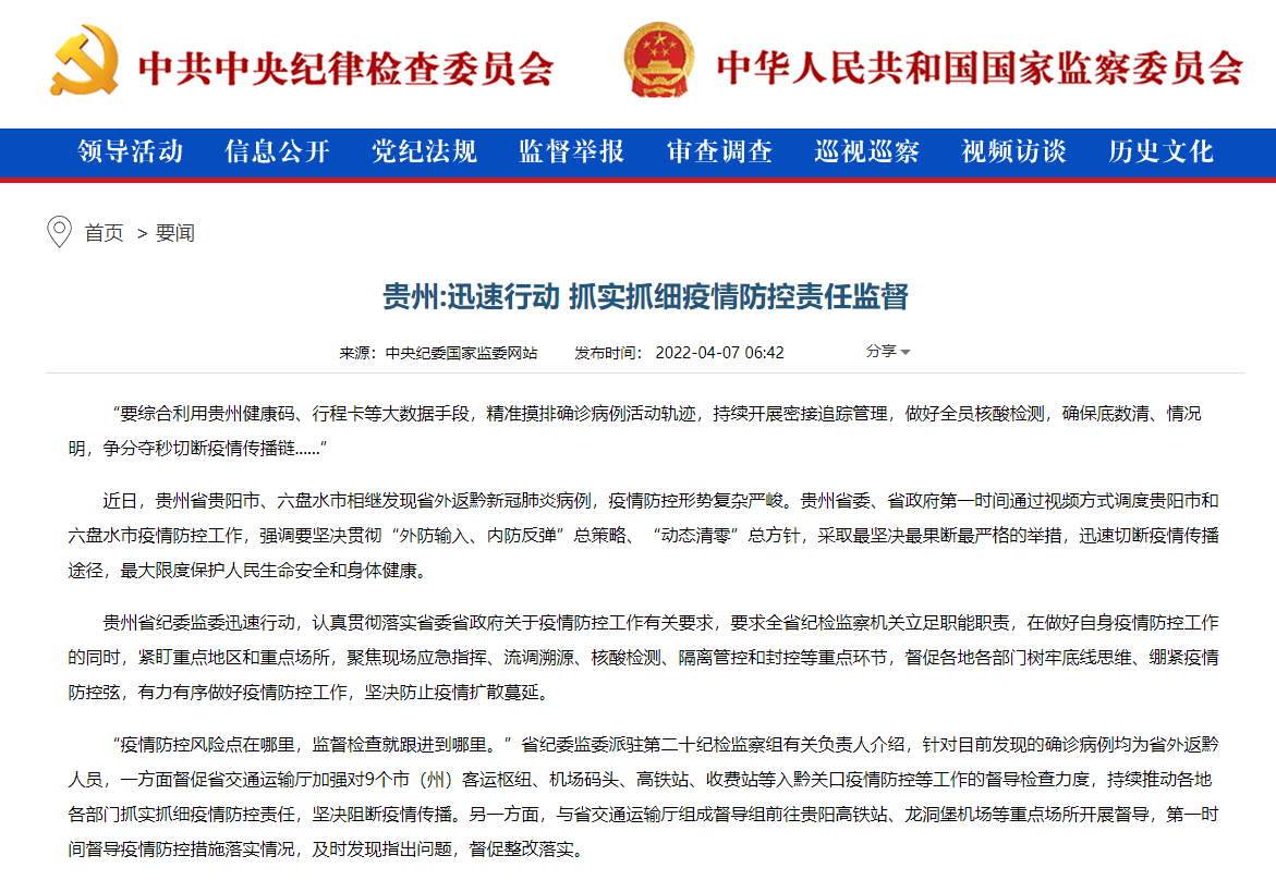 中央纪委国家监委网站:贵州迅速行动 抓实抓细疫情防控责任监督