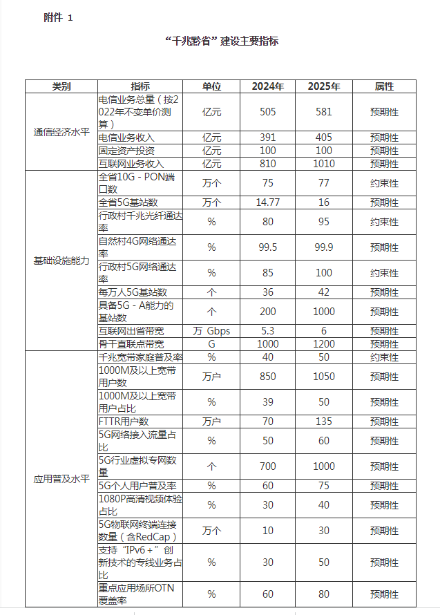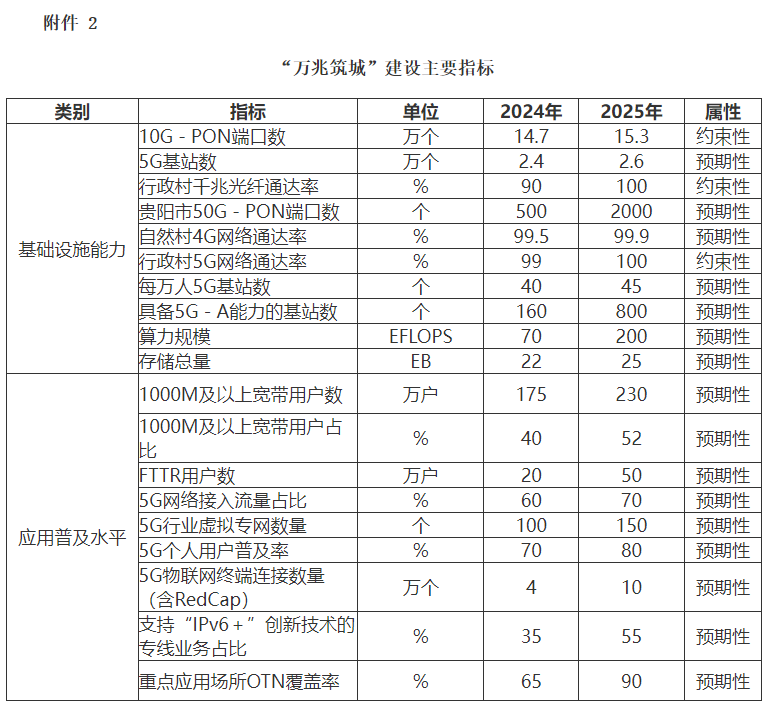 为促进全省数字经济与实体经济深度融合,赋能各行业转型升级,加快推动贵州省建设数字经济发展创新区,将贵州省打造成为全国首批千兆省份之一,率先将贵阳市打造成万兆城市,结合我省实际,制定本计划。以习近平新时代中国特色社会主义思想为指导,全面贯彻党的二十大精神,深入贯彻落实习近平总书记视察贵州重要讲话精神,按照省第十三次党代会部署,加快推进制造强国、网络强国建设的贵州实践,坚持围绕“四新”主攻“四化”,全力打造“四区一高地”,不断完善数字基础设施和服务体系,持续提升信息通信供给能力和行业融合发展水平。到2025年,全省城镇、农村基本实现千兆光网、5G网络全覆盖,贵阳市光纤网络具备“万兆到户”、移动网络具备万兆下行能力,网络接入能力、覆盖能力跻身全国第一方阵,将贵州省建设成“千兆黔省”,贵阳市打造成“万兆筑城”。1. 加快千兆光网覆盖。在逐步实现城市千兆光网全覆盖的基础上,加速向农村地区延伸覆盖,有序推进行政村千兆光网建设,推动行政村及以上区域具备千兆接入能力。加快以10G-PON(10Gbps光纤链路传输)技术推进宽带网络能力升级,在全省新建住宅、老旧小区改造中逐步推广FTTR(光纤到房间)部署,在重点场所部署50G-PON试点。引领家庭光纤网络业务向多屏化、多元化和智能化演进,探索8K超高清视频、裸眼3D、XR(扩展现实)等创新业务,提升用户视听体验。到2025年,全省行政村千兆光网通达率达到95%以上,10G-PON数累计达到77万个,FTTR用户数达到135万,千兆宽带用户数达到1050万,重点场所OTN(光传送网)覆盖率达到80%。(牵头单位:省通信管理局,责任单位:各市〔州〕人民政府,各基础电信企业、省铁塔公司)2. 提升网络输送能力。提升网间通信质量,扩容贵阳贵安国家级互联网直联点带宽。加快200G/400G超高速传输系统建设,加快贵州枢纽节点数据中心集群至京津冀、长三角、成渝、粤港澳等国家其他枢纽数据中心集群的直连网络建设,逐步建成数据中心集群间一跳直达链路。到2025年,互联网出省带宽达到6万Gbps,贵州枢纽节点数据中心集群到国家其他枢纽节点数据中心集群间的网络时延不高于理论值1.5倍。(牵头单位:省通信管理局,责任单位:各基础电信企业)3. 推进5G网络建设。实施“信号升格”行动,完善在交通枢纽、产业园区、大型商场、医院、学校、文体场馆、旅游景点等重点场所的深度覆盖,打造城区深度覆盖、县城和乡镇重点区域全面覆盖、农村区域重点覆盖的5G精品网络。开展5G-A(5G增强)部署,持续提升用户5G高速率的网络感知体验。到2025年,全省5G基站累计达16万个(包含逻辑站),行政村5G通达率达100%(FAST宁静区除外)。力争获批电信普遍服务项目4G/5G基站2000个,中央财政补助资金2亿元以上。具备5G-A能力的基站达到1000个。(牵头单位:省通信管理局,责任单位:各市〔州〕人民政府,各基础电信企业、省铁塔公司)4. 加快5G RedCap(5G轻量化)规模部署。有序推动既有5G基站的5G RedCap能力升级,新建5G基站支持5G RedCap。贵阳贵安、遵义、毕节等重点城市率先实现5G RedCap连续覆盖。加快5G RedCap与网络切片、高精度定位等5G增强功能结合,推动物联网终端向5G RedCap等5G物联网迁移。到2025年,全省县级及以上城市5G RedCap规模覆盖,以5G RedCap为代表的5G物联网连接终端数量达到30万。(牵头单位:省通信管理局,责任单位:各市〔州〕人民政府,各基础电信企业)5. 推进5G行业专网建设。各基础电信企业基于网络优势,结合网络切片、边缘计算、服务能力开放等技术手段,打造经济高效、安全可靠的5G行业专网,推进政务、制造、交通、能源等领域以及物流港口、工业园区等场所开展5G专网建设。到2025年,建成超过1000个5G行业专网。(牵头单位:省通信管理局,责任单位:各市〔州〕人民政府,省有关行业主管部门、各基础电信企业、省铁塔公司)(三)开展“IPv6+”创新行动,加快构建下一代互联网体系6. 加快IPv6规模部署。以各行业数字化转型需求为导向,深入开展骨干网、城域网、5G网络等网络基础设施IPv6改造升级,实施“网络去NAT”专项行动。逐步实现IPv6网络时延、丢包率等关键指标优于IPv4。持续提高算力中心、云服务平台等应用基础设施IPv6部署和应用水平,稳步推进IPv6流量提升。到2025年,全省支持“IPv6+”技术的专线占比达到50%,贵阳贵安达到55%。(牵头单位:省通信管理局,责任单位:各市〔州〕人民政府,各基础电信企业、相关互联网企业)7. 深化IPv6行业融合应用。激发应用生态IPv6创新活力,在政务、金融、能源、交通、教育、制造等行业和领域,加快IPv6规模化部署,推动分段路由、随流检测等“IPv6+”技术的广泛应用。到2025年,在相关重点行业打造10个以上应用。(牵头单位:省有关行业主管部门,责任单位:各市〔州〕人民政府,各基础电信企业)(四)开展“双千兆”应用深化行动,赋能各行业数字化转型8. 深化“双千兆”融合应用普及。聚焦行业数字化转型需求,面向工业、文旅、医疗、教育、农业、矿山等重点领域实施千兆光网、5G网络深度覆盖,深入开展不同应用场景的“双千兆”协同创新。(1)助力实施新型工业化。强化数字技术在“六大产业基地”的应用,加快工业领域能源、电子、白酒等行业标识解析二级节点建设,支持装备制造、机械制造、化工、酱香白酒等龙头企业建设行业级节点,建成一批5G工厂,推