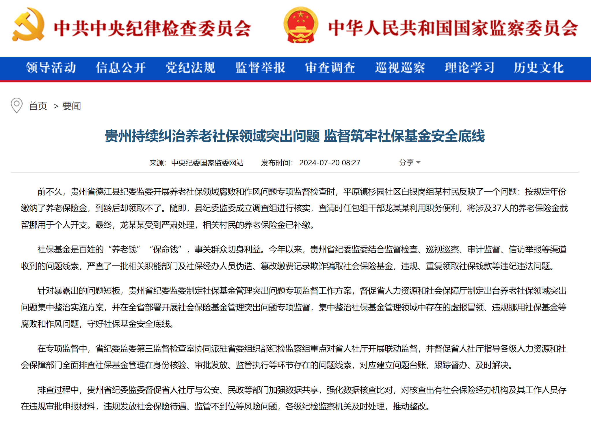 贵州持续纠治养老社保领域突出问题