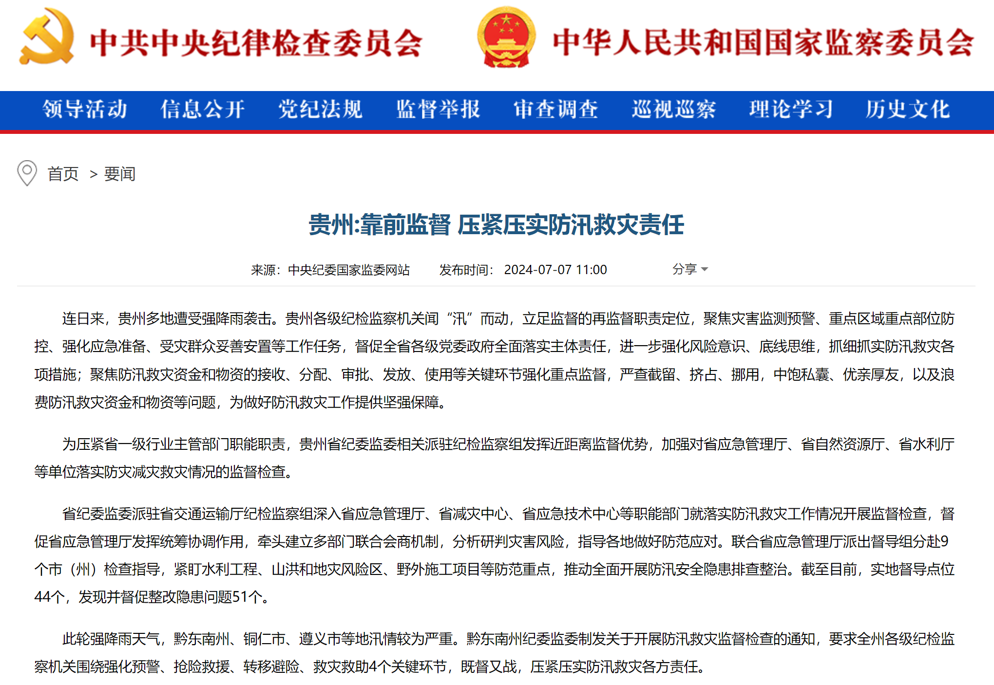 中央纪委国家监委网站丨贵州:靠前监督 压紧压实防汛救灾责任