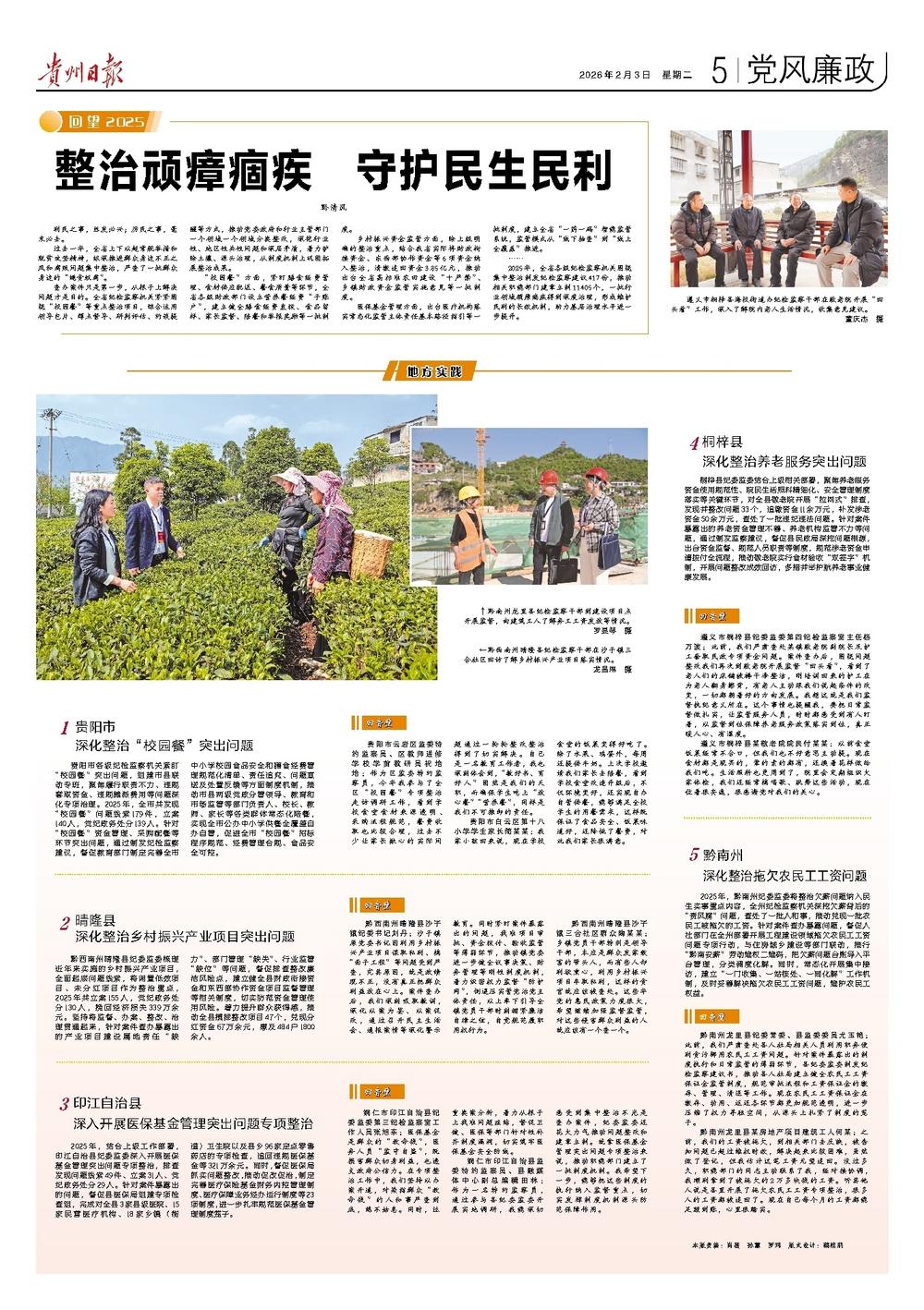 黔西南州晴隆县纪委监委梳理近年来实施的乡村振兴产业项目,全面起底问题线索,将闲置低效项目、未分红项目作为整治重点,2025年共立案155人,党纪政务处分130人,挽回经济损失339万余元。坚持将监督、办案、整改、治理贯通起来,针对案件查办暴露出的产业项目建设属地责任“缺力”、部门管理“缺失”、行业监管“缺位”等问题,督促排查整改廉洁风险点,建立健全县财政衔接资金和东西部协作资金项目监督管理等相关制度,切实防范资金管理使用风险。着力提升群众获得感,推动全县摸排整改项目47个,兑现分红资金67万余元,惠及484户1800余人。