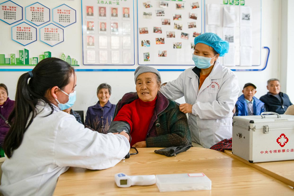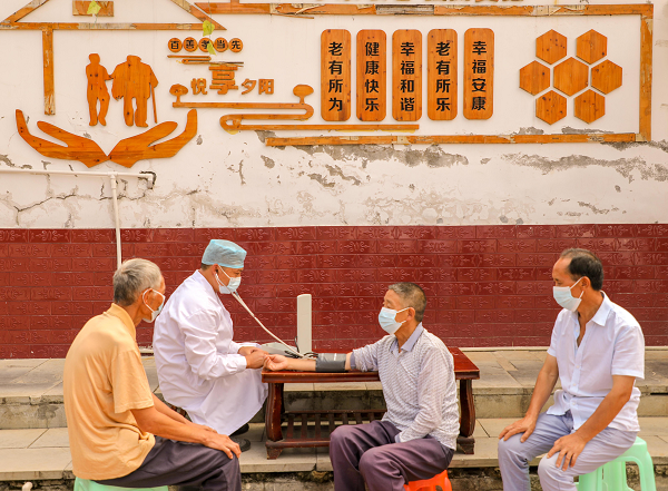 毕节市黔西市着力构建居家社区机构相协调、医养康养相结合的养老服务体系,让老年人健康幸福地安享晚年。图为该市乡镇签约家庭医生正在为老年人做日常健康检查。(毕节市黔西市纪委监委供 张利军 摄)