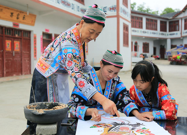 在安顺经开区三合苗寨,将刺绣和绘画技艺传授给后辈是老人们的一大生活趣事。图为一老人在教自己的女儿和孙女绘画苗族图腾。(安顺经开区纪检监察工委供 黄芬 摄)