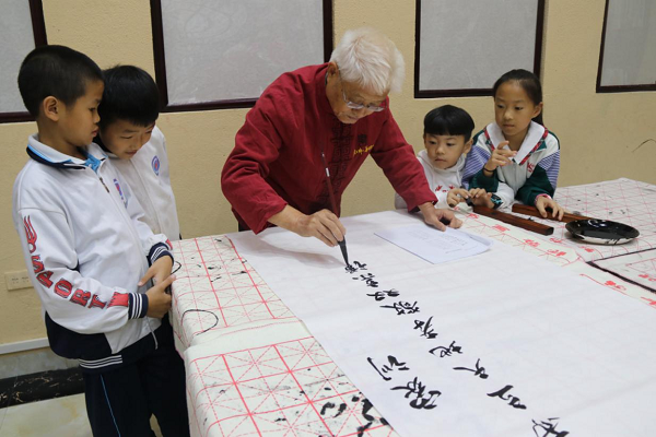 铜仁市印江县是中国书法之乡,喜爱书法的老人们茶余饭后会到文艺角教学生们书法,这成为老人们乐享晚年生活的一种方式。图为该县一老年书法爱好者在学生们的注视下书写家训。(铜仁市印江自治县纪委监委供 杨秀明 摄)
